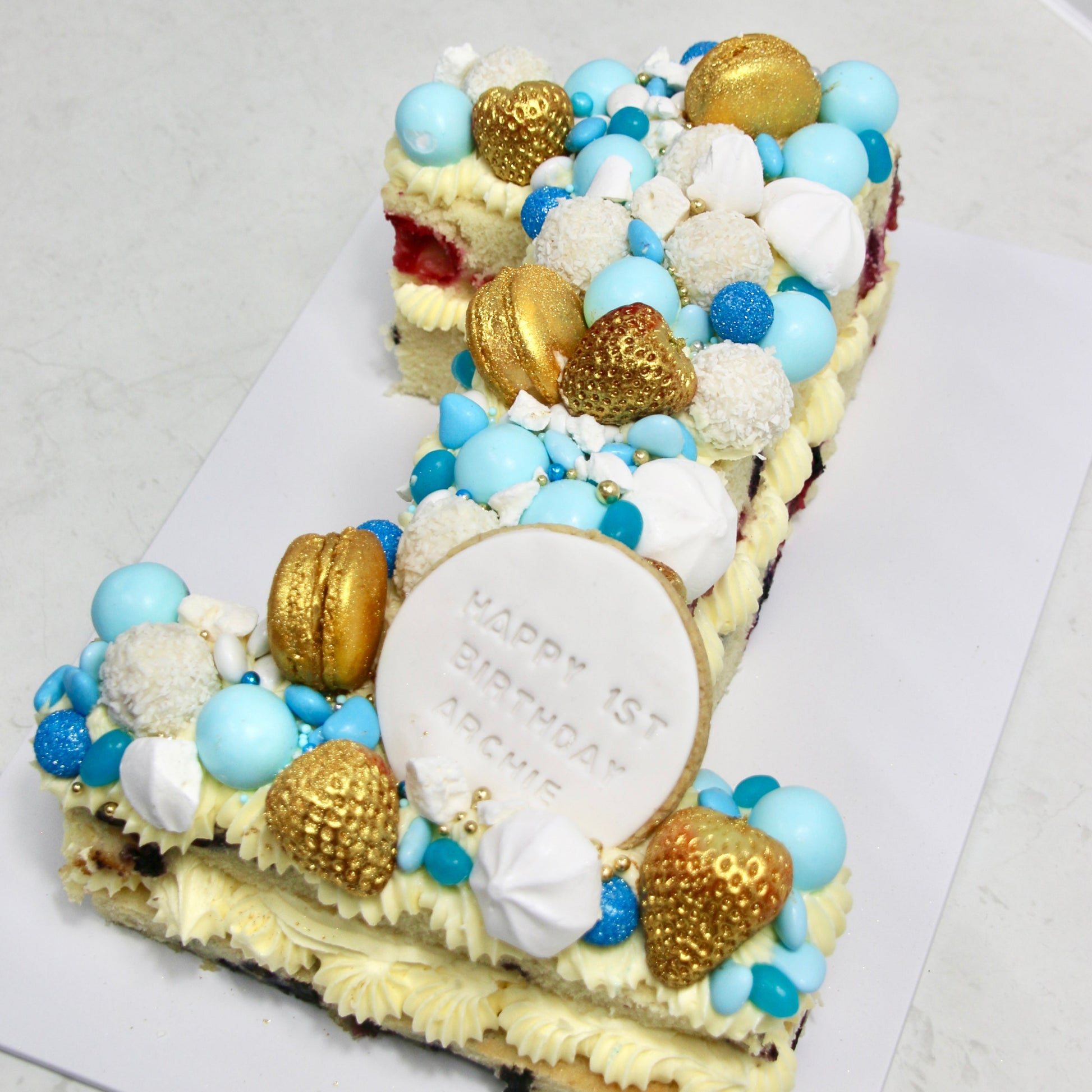 This cake features 2 layers of you chosen cake flavour, layered with vanilla buttercream and loaded with macarons, lollies, meringues, chocolates, and fresh strawberries.